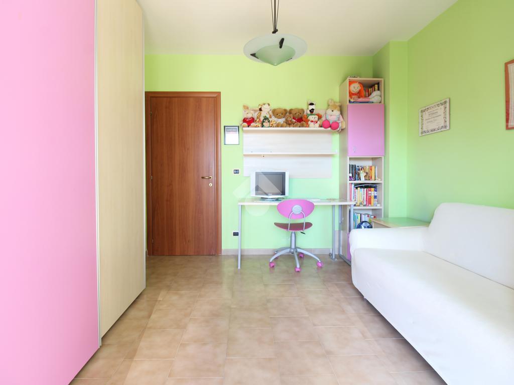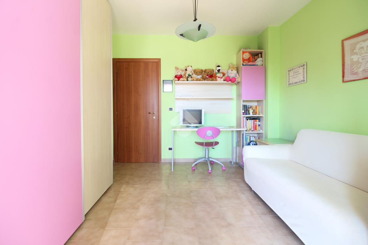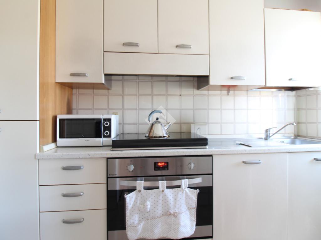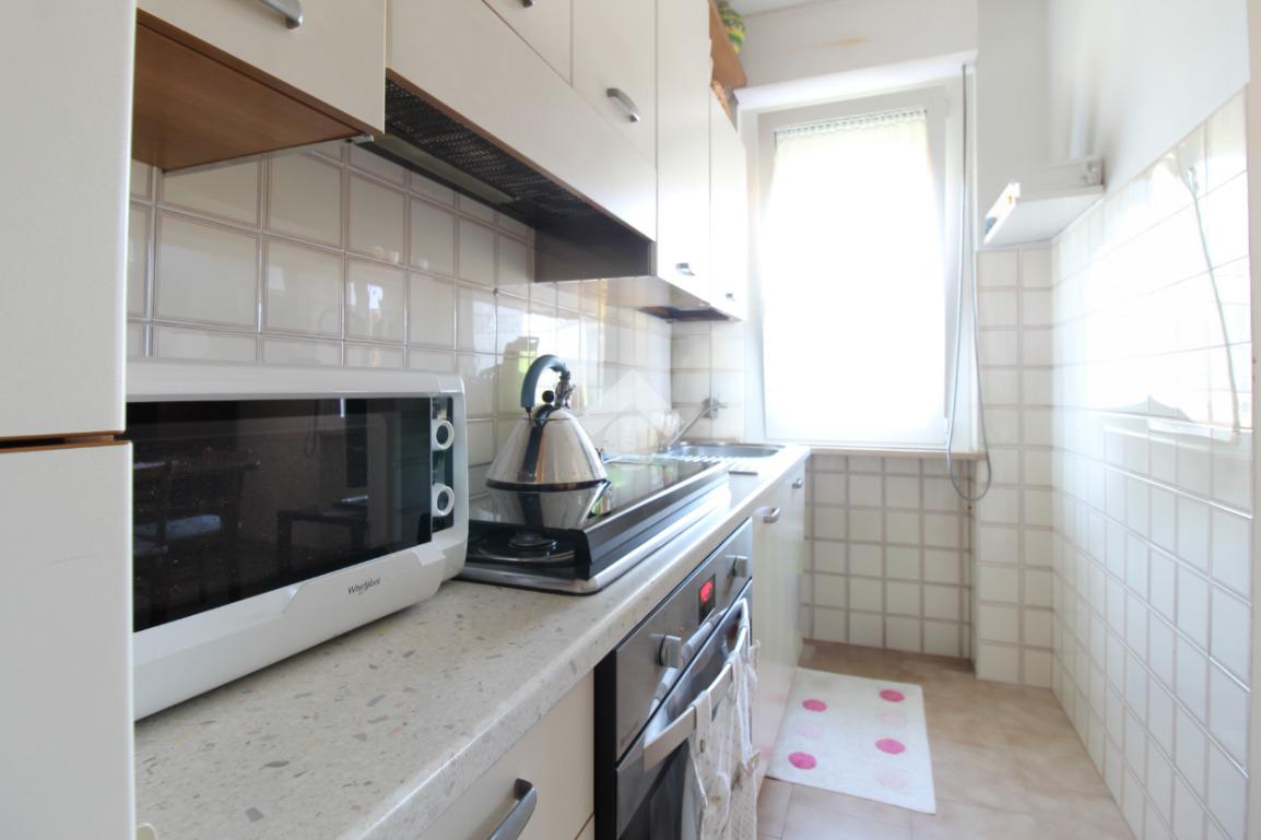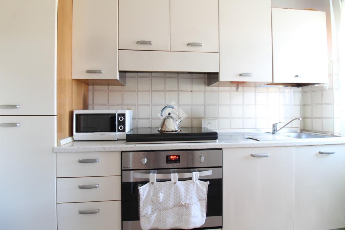 L'appartamento è composto da: ingresso su soggiorno, sala da pranzo con cucinotto, due camere da letto matrimoniali, una cameretta e due bagni finestrati di cui uno con vasca. Dal soggiorno, da una camera matrimoniale e dalla cameretta, si ha accesso ad un balcone esposto ad ovest.